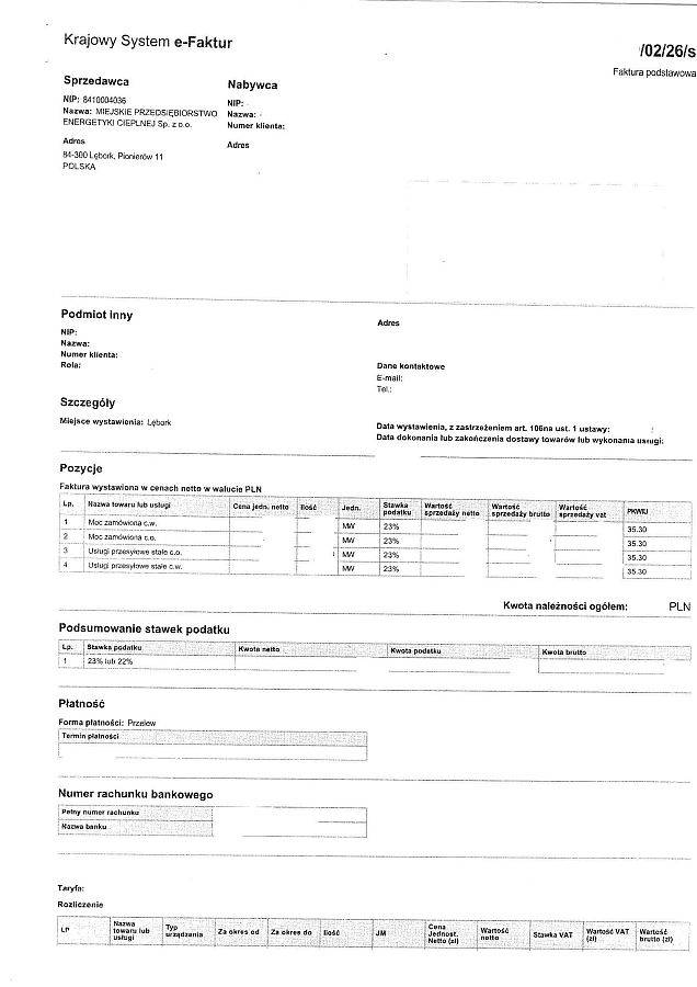 W związku z wejściem w życie Krajowego Systemu e-Faktur (KSeF) informujemy o zmianie szaty graficznej wystawianych faktur za dostarczone ciepło (opłata stała i opłata zmienna). Nowy wzór faktur został dostosowany do aktualnych wymogów prawnych oraz standardów faktur ustrukturyzowanych. Prosimy o zapoznanie się z nowym formatem faktury. W razie pytań lub wątpliwości zachęcamy do kontaktu. Dodatkowo informujemy, że MPEC Sp. z o.o. rozpocznie przesyłanie faktur za pośrednictwem systemu KSeF od dnia 01.04.2026.
